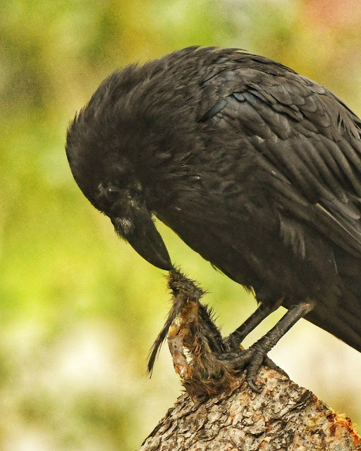 Common Raven nibbling on a rodent, likely a ground squirrel.
